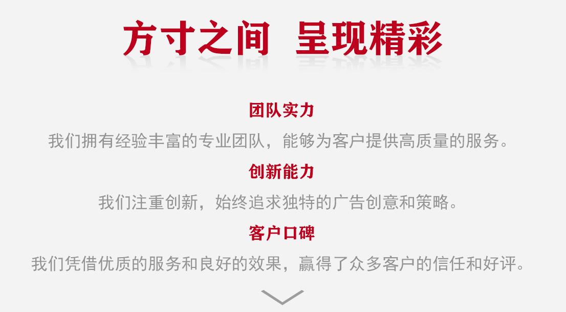 陽泉方呈廣告有限公司是一家集媒體宣傳、品牌推廣、大型活動、廣告制作及發(fā)布等業(yè)務(wù)于一身的綜合性廣告公司。成立以來先后為百余家集團(tuán)公司和近千家中小企業(yè)服務(wù),多次榮獲廣告市場A級單位,受到市委市領(lǐng)導(dǎo)的高度評價(jià),是山西工程技術(shù)學(xué)院的實(shí)訓(xùn)基地。在社會上享有良好的聲譽(yù),在廣告行業(yè)擁有較高的知名度。 我公司一直秉承“嚴(yán)、細(xì)、實(shí)、恒、新、誠”六字管理理念,始終堅(jiān)持以人為本、誠信經(jīng)營的原則,不斷完善企業(yè)內(nèi)部管理,培養(yǎng)建設(shè)人才隊(duì)伍,拓展業(yè)務(wù)方面,精益求精,力爭樹立廣告業(yè)精英典范!